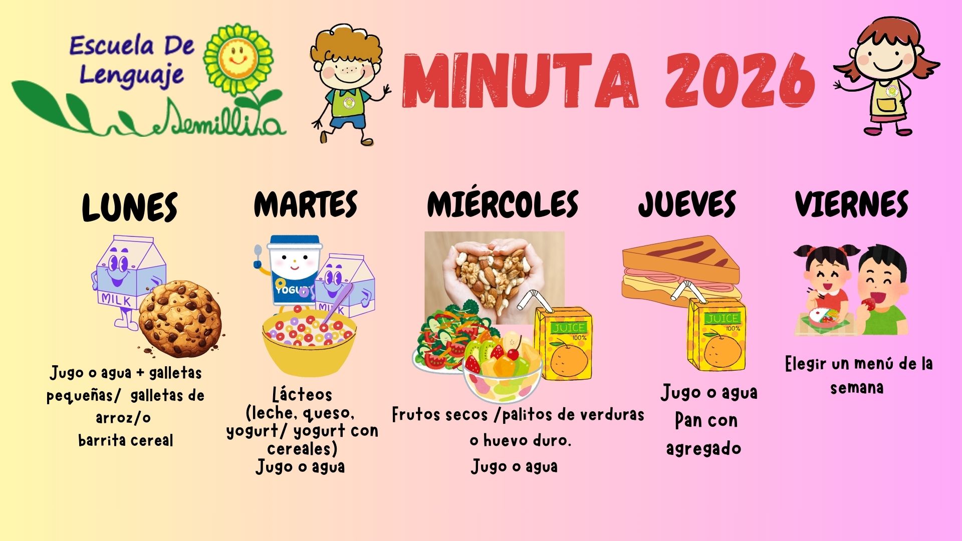 En nuestra escuela, fomentamos una vida saludable desde la infancia, y una alimentación equilibrada es clave para el crecimiento y el aprendizaje de nuestros estudiantes. La minuta diaria que recomendamos está diseñada para asegurar que los niños reciban los nutrientes necesarios para su desarrollo físico y cognitivo.